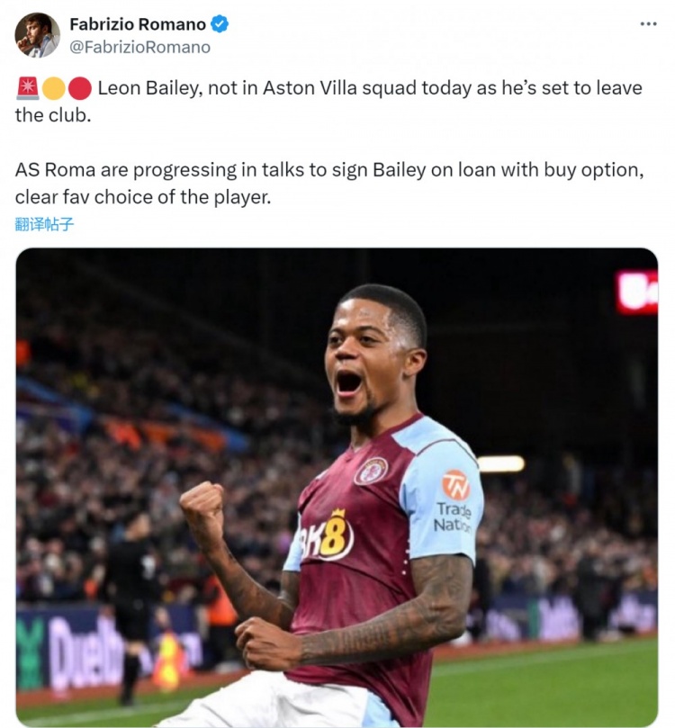 8月16日最新消息,转会专家罗马诺透露,罗马俱乐部正积极运作牙买加边锋利昂-贝利的租借事宜。