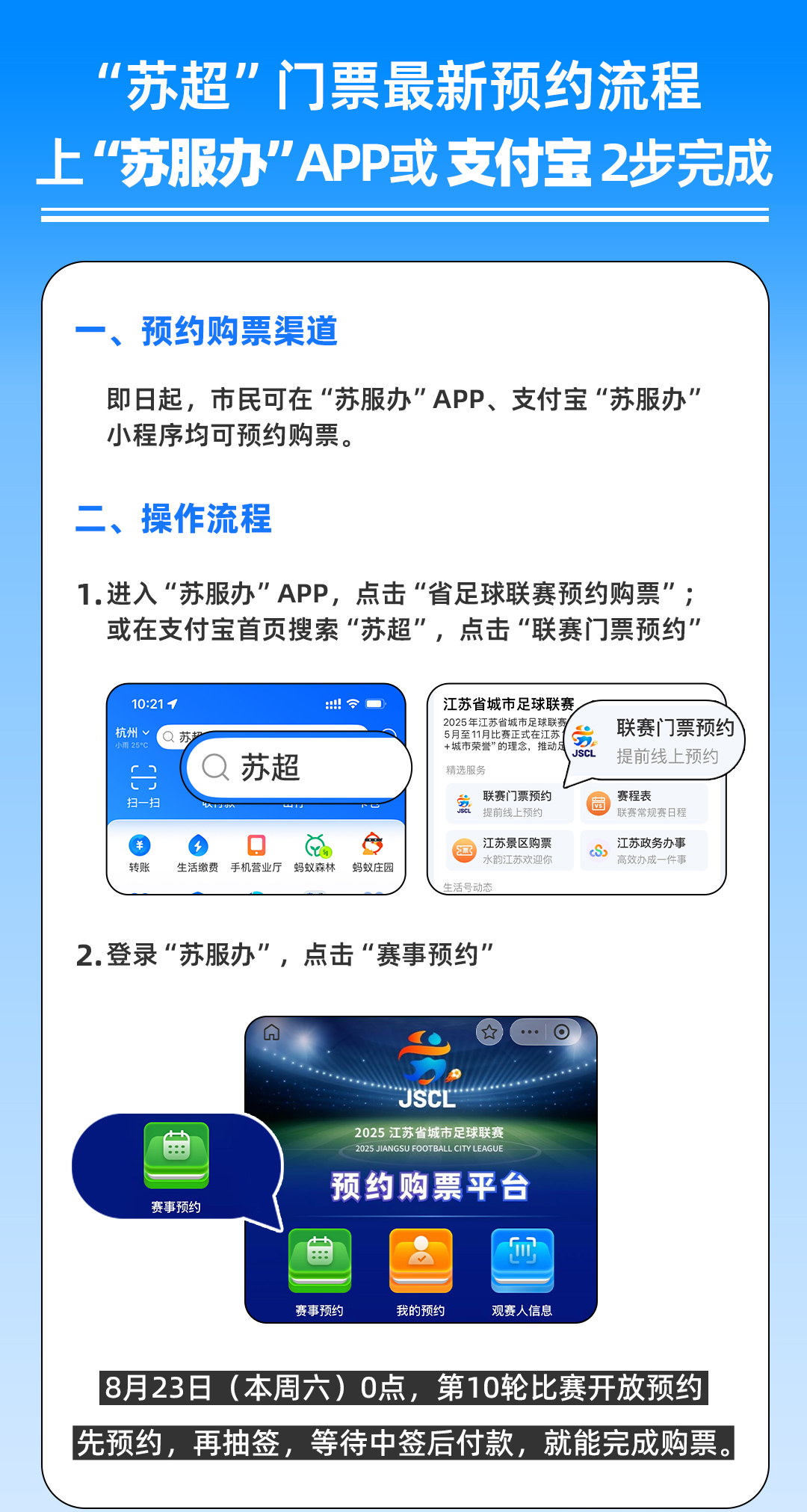 根据新规,第10轮所有比赛将于8月23日0时至24日24时进行统一预约。球迷可通过“苏服办”App或支付宝、微信小程序进入统一票务平台提交预约申请,原有各市售票渠道同步停止使用。