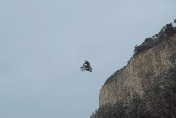 之后反派骑着摩托车腾空一跃横跨悬崖峭壁,轻轻松松安稳落地。
