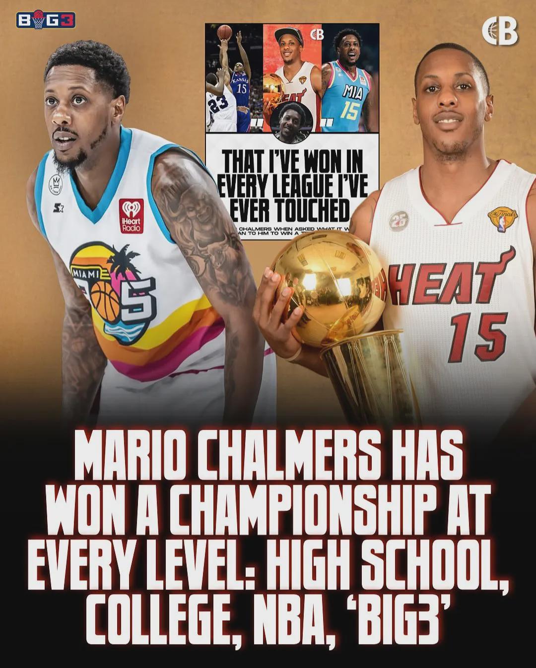 而且这6次冠军,查尔莫斯都不是混来的。高中是球队大腿,大学时率领堪萨斯夺冠,他本人荣膺MOP(四强赛最杰出球员)。热火两连冠时期,查尔莫斯是球队主力控卫,两次总决赛都有单场20+的表现,今天在BIG 3更是绝杀夺冠!